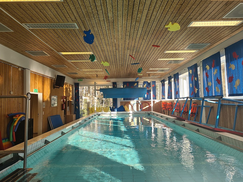 Då bassängen är relativt liten (3,80 x 11,60 meter) erbjuder vi här i första hand simskola för grupperna Baddaren, Sköldpaddan, Silverpingvinen, och Guldpingvinen. För grupperna Fisken och Hajen hänvisar vi till något av de andra badhusen där vi erbjuder simskola.